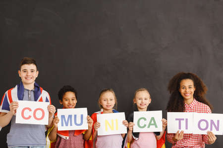 Cheerful children holding communication inscription together
