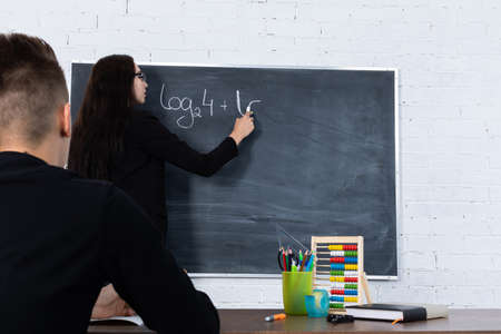 The teacher conducts a math lesson. A school board hung on a white brick wall. Class at school.