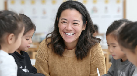 A joyful teacher shares a warm moment with young learners, fostering creativity and connection in a bright classroom filled with engaging activities for all.