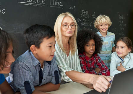 Lovely little pupil looking at laptop screen. Caucasian middle-aged teacher standing near him and classmate sitting at table. They watching and listening boy. Knowledge and digital education concept