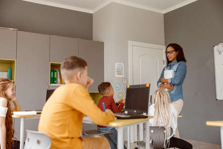 Diverse group of children using computers during IT class in school with young female teacher