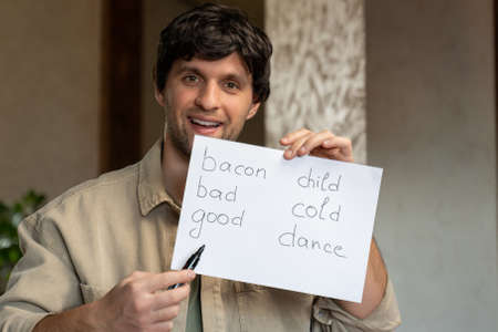 Online English language courses at home. A smiling man teaches children by remotely explaining English words. The concept of distance education.