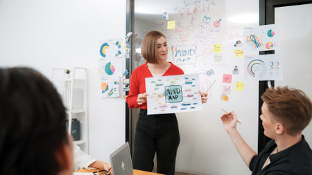 Professional young leader present business idea by using mind map at business meeting surrounded by professional cooperate colleague discussing and brainstorming about her strategy. Immaculate.