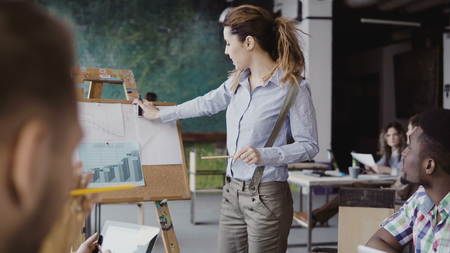 Young beautiful female manager motivates multiethnic team to work. Team leader presenting financial data at loft office.