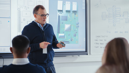 Diverse Team of Computer Design Students Listen to Teacher at University, Looking at Interactive Whiteboard that Shows 3D Concept Model of Printed Circuit