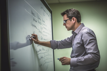 Science teacher of middle age standing in front of the whiteboard in a classroom, guiding students through scientific principles. The teacher professional approach ensures an effective learning environment.