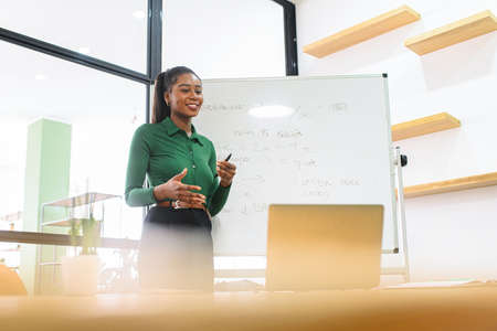 African-Ameriacn young woman is conducts online webinars, online classes, online presentation. Multiracial showing something on a flip-chart in a office classroom to virtual audience on a laptop