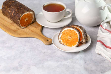 Sweet chocolate roll with tangerine filling and a cup of tea. Copy space.