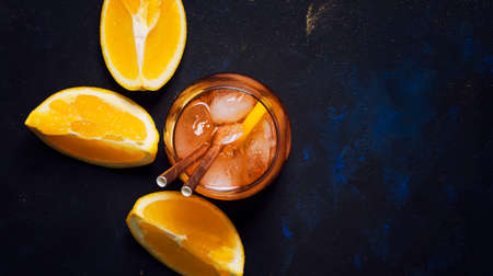 Summer alcoholic cocktail with bitter, sparkling wine, soda, orange and ice, dark background, top view