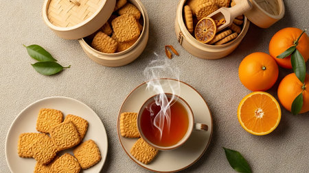 A warm chinese lunar new year setting with steaming tea and traditional treats surrounded by oranges.