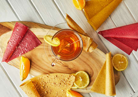 Sweet pastille of pure fruits in rolls with citrus fruits and tea with lemon. Healthy sweets - lollipops, fruit chips. Natural sweets from berries and fruits. Diet vitamin and vegan food. Flat lay