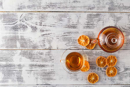 Fruit tea with cinnamon and dried orange in a cup - teacup on gray table. Top view, overhead