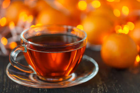 Orange cup of tea, sinnamon, slice of dried orange, lights on wooden background, banner, copy space