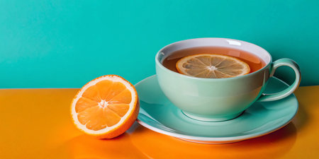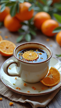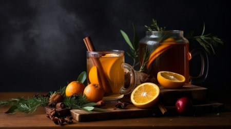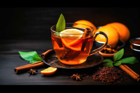 Warm spiced tea with fresh citrus slices and delicate floral accents. That the image is generated using AI.