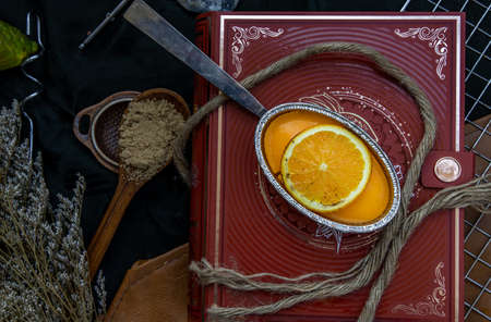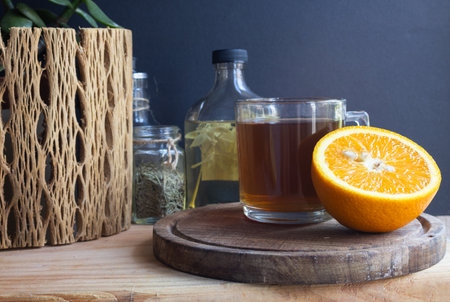 A fresho orannge slice join to an herbal tea, jars of herbs in the background.Natural remedies and alternative medicine for health and relaxation Copy space. Horizontal real picture