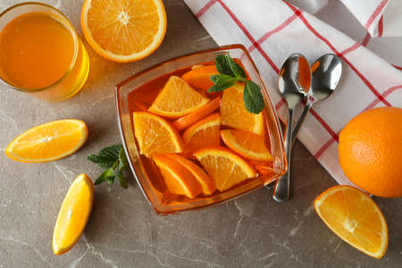 Concept of dessert with bowl of orange jelly with orange slices on gray table