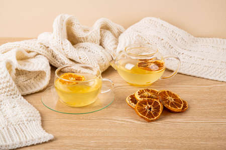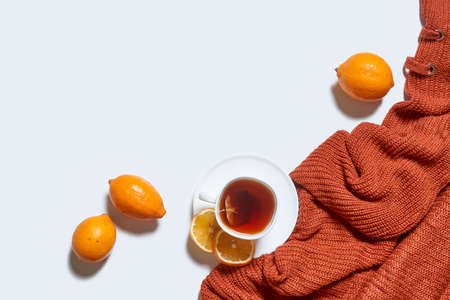 Autumn background with tea and knitted sweater on white background. Hot herbal lemon tea with orange warming pullover on white background. Fall background
