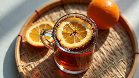 Refreshing citrus tea with sea buckthorn and orange slice on bamboo mat. That the image is generated using AI.