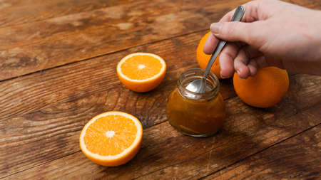 Jar of orange jam on white wooden background from top view. Woman hand with a metal spoon. Homemade orange marmalade, confiture in thick syrup.