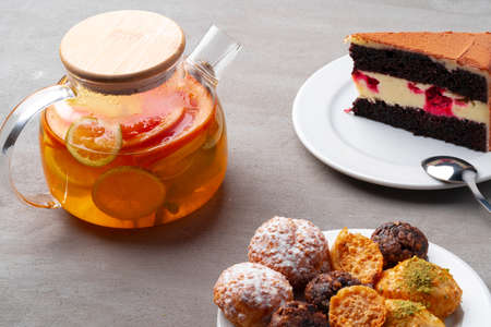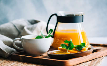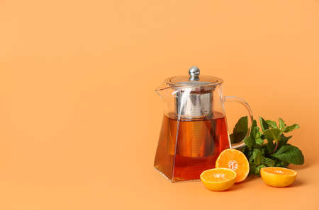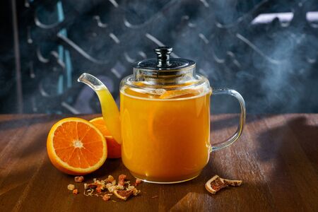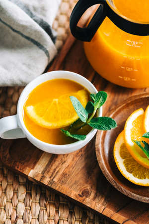 Brewed sea buckthorn tea in a teapot with orange in glass cups with fresh orange, mint and honey.