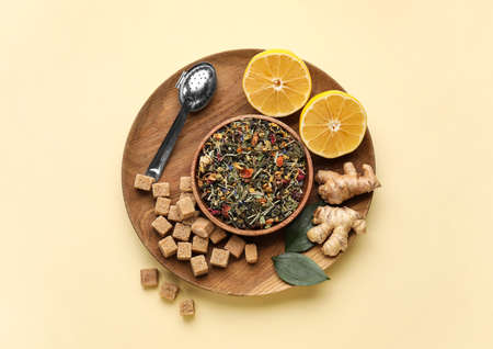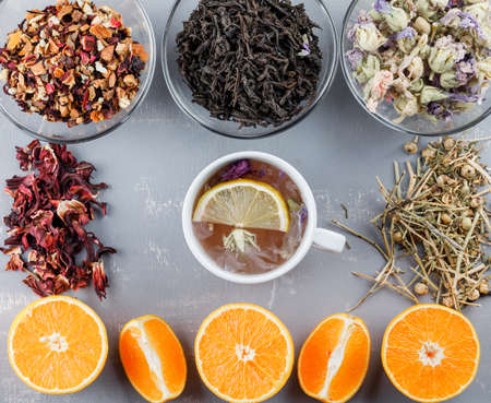 Lemony tea in a cup with oranges, herbs flat lay on a plaster background