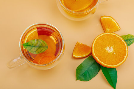 Orange tea in glass cups with ripe fruits. Refreshment seasonal drink, conceptual background with green citrus leaves. Modern style, selective focus, top view