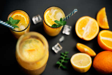 Delicious fresh orange juice with ice, mint and fresh fruits on black table background
