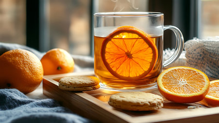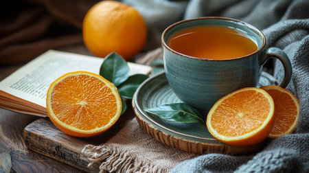 Warm and inviting scene featuring a cup of tea, fresh orange slices, and a book on a wooden table, surrounded by soft fabrics for a cozy vibe.