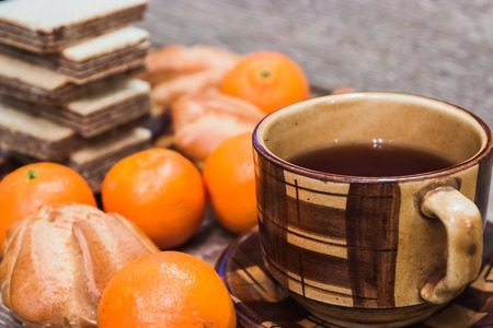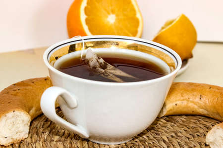 On the table is a mug of tea, next to ruddy bagels with poppy seeds and citrus fruits. Tea party. Selective shot.