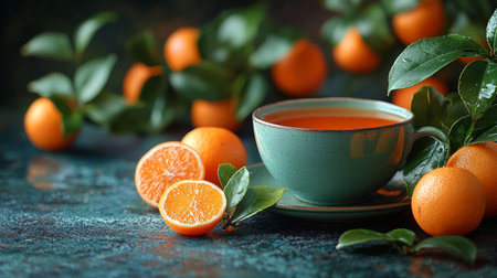 A steaming cup of tea surrounded by fresh oranges, green leaves, and natural textures on a dark rustic surface.
