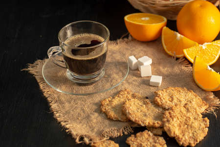 Citrus drink, tea with petals in a transparent glass mug with slices of sweet orange and refined sugar. Slicing fruit on a wooden board with a brown napkin in a cozy dark background in a low key