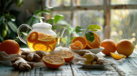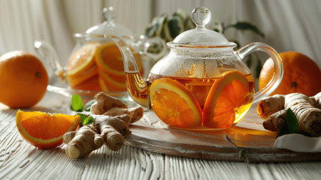 a cup of steaming hot ginger orange tea, accompanied by a glass teapot, slices of fresh ginger, and vibrant oranges arranged on a white wooden table.