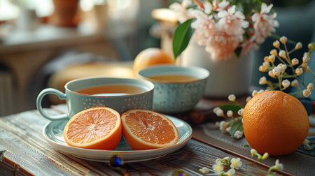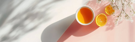 A soothing arrangement features a cup filled with amber liquid, paired with vibrant orange slices. The minimalist design blends warm colors into calming white, creating a serene atmosphere.