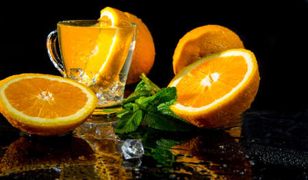 Splashes in a glass with orange juice and mint orange halves on a black background, Healthy lifestyle concept, copy space, levitation