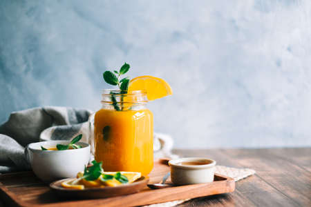 Sea buckthorn tea in a glass with fresh orange, mint and honey on table. copy space