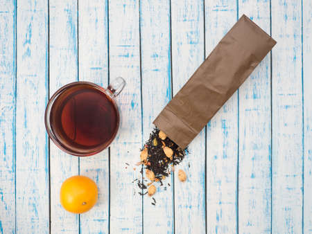 Tea with orange, mixed dried herbs in a cup on plaster background, top view.