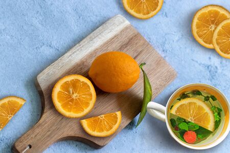 Lemons and oranges wooden chopping board, herbal tea on blue background. Natural freshness, juicy citrus ingredients