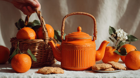 A cheerful orange teapot sits among fresh oranges and homemade cookies, creating a warm and inviting scene perfect for afternoon tea gatherings.