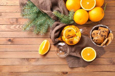 Wooden table topped with tea, orange, cinnamon, peppermint. Generative AI