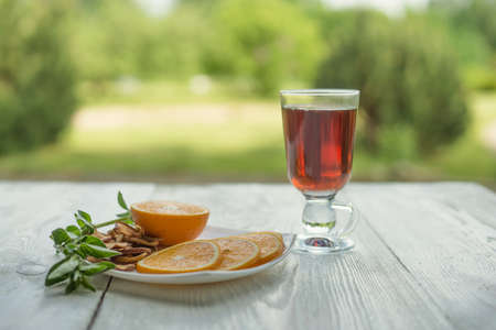 Shot of glass cup of black tea with orange on wood table outdoors.
