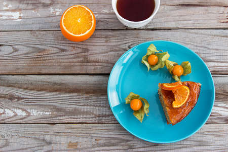 Traditional French sweet dessert : Orange cheese cake on beautiful background. One piece, Delicious seasonal breakfast. Top view, Selective focus.