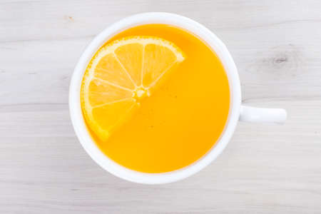 Cup of lemon tea with ginger. On a white wooden table. Top View.