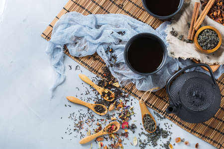 Food and drink, still life concept. Selection assortment of japanese chinese herbal masala tea infusion beverage teapot on the table. Copy space background, top view, flat lay