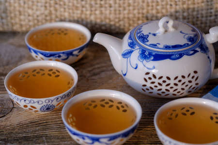 Asian tea ceremony. Teapot and tea cups with tea drink on table.