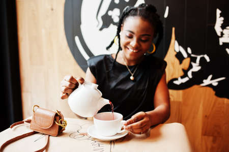 Young african woman in black blouse at cafe drink tea from teapot.