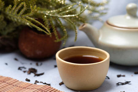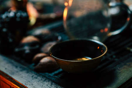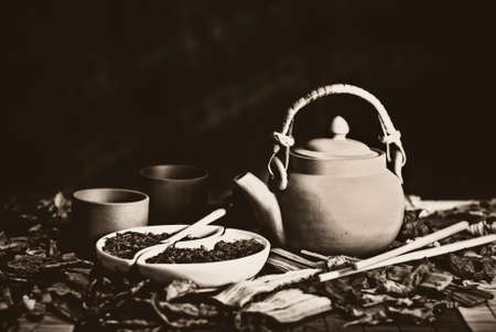 Dried leaves of Chinese tea in a beautiful kiramic soda. Tea ceremony. Red traditional Chinese drink. Dark utensils.