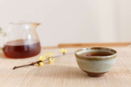 Tea ceremony with smoking incense. Incense stick and tea ceremony.