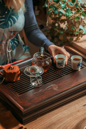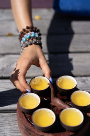Close-up with the hands of a tea ceremony master in a tea shop, pouring tea for tasting in special cups on a bamboo table with a tray.