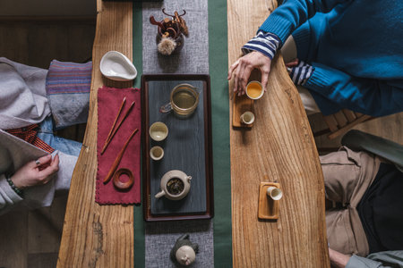 Top view tea set a wooden table for tea ceremony background. Woman and man holding a cup of tea