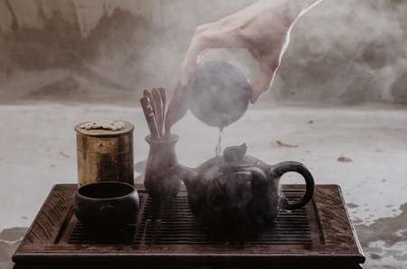 tea ceremony, tea brewing on a brown tea board, dark abstract tea background